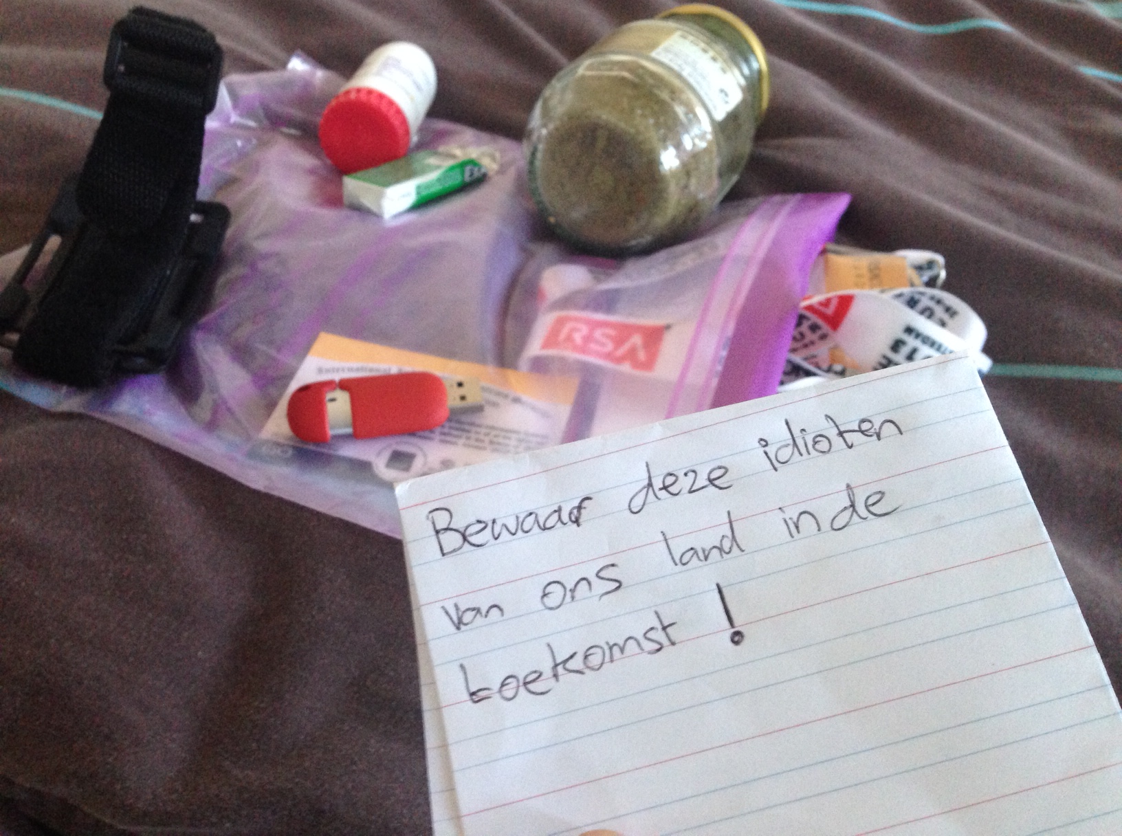 However, we received a package from the Dutch authorities with an evidence bag and a memory stick (along with a few other items that no amount of therapy will help us forget). Thankfully we don’t read Dutch, but we are pretty sure the phrase “Bewaar deze idioten van ons land in de toekomst” is not a good one.